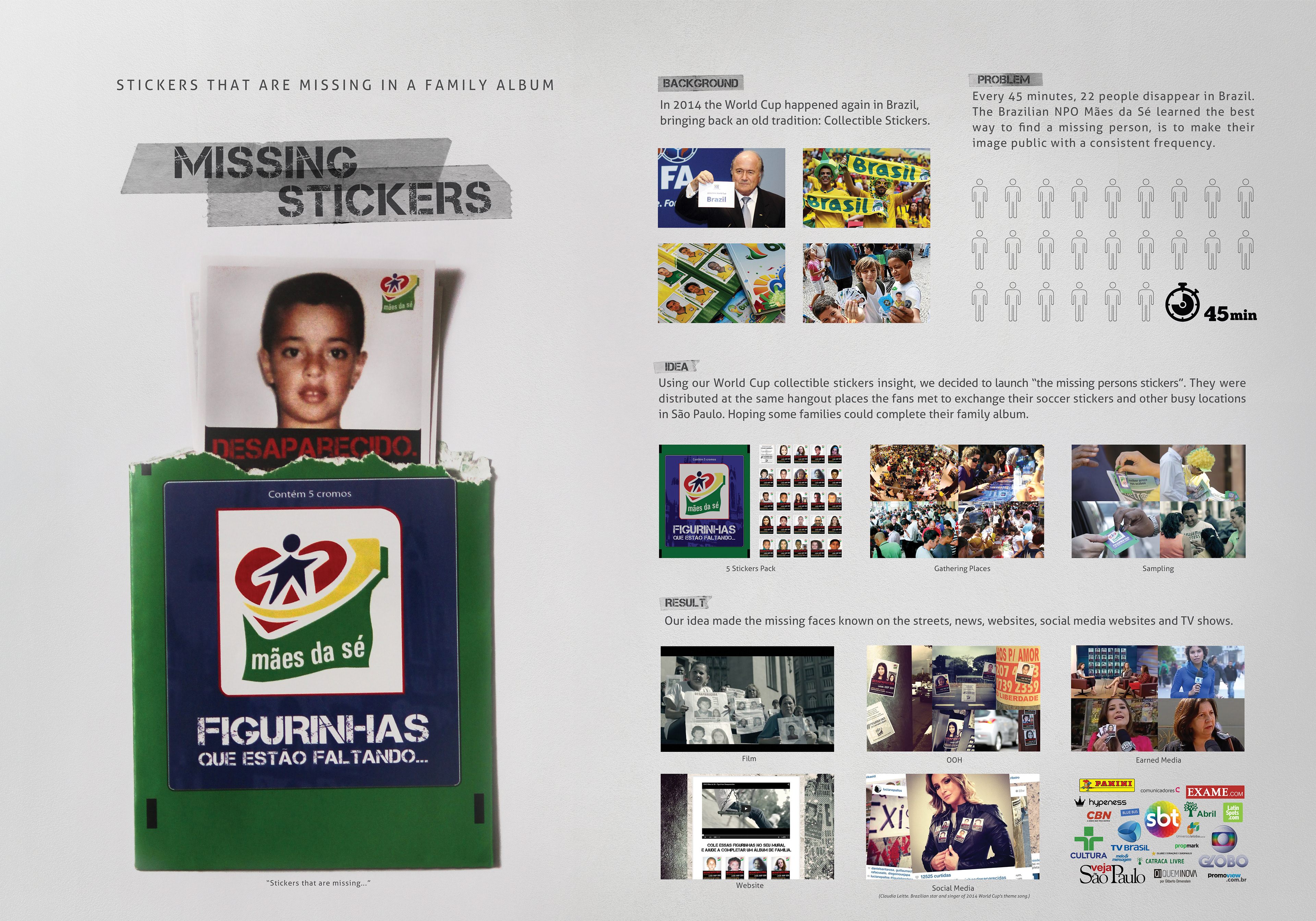 Missing Stickers - Mães da Sé Wave Festival 2015 - Green Wave - Shortlist Renato Castelo Branco ESPM - 2014 Every 45 minutes 22 people disappear in Brazil. The sticker’s fever is all over Brazil. Recently we’ve seen parents, children and friends exchanging stickers to complete their albums. While some seek new stickers for their albums others seek stickers to complete their family albums. But there’re “special” stickers missing in family albums. The more these stickers are shown, more hope these missing persons have to be found.