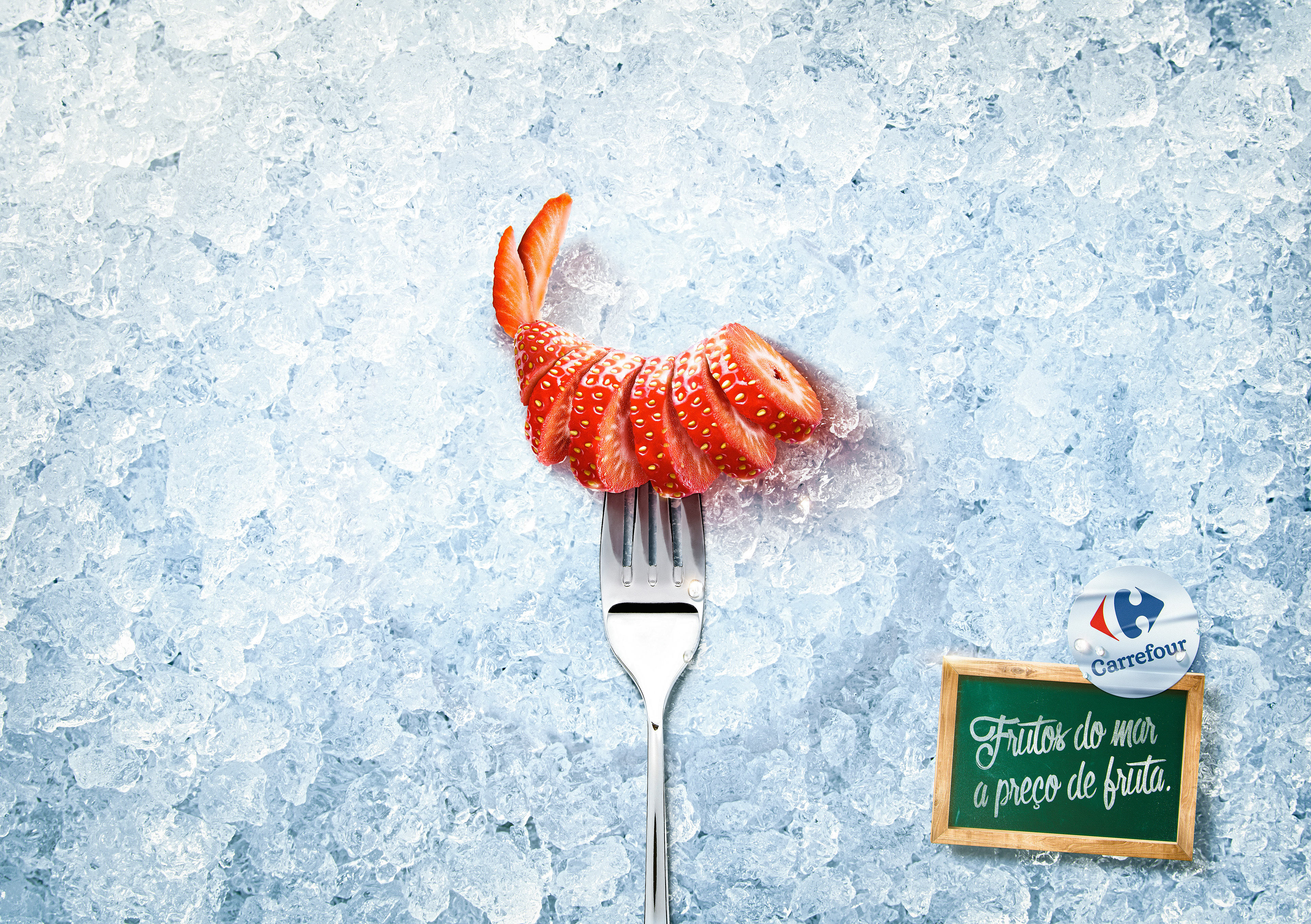 No Brasil, quando algo é muito barato dizemos que está a preço de banana. A partir disso criamos anúncios para vender frutos do mar em promoção transformando eles em frutas.